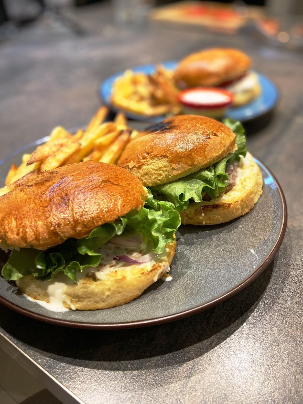 - Une fois les steaks cuits, mettre dans l’ordre dans le pain à burger : steak, cancoillote ou fromage de chèvre (ou oeuf au plat si vous êtes intolérant au lactose) et ajoutez oignon rouge, tomate, salade, pickles, selon vos goûts