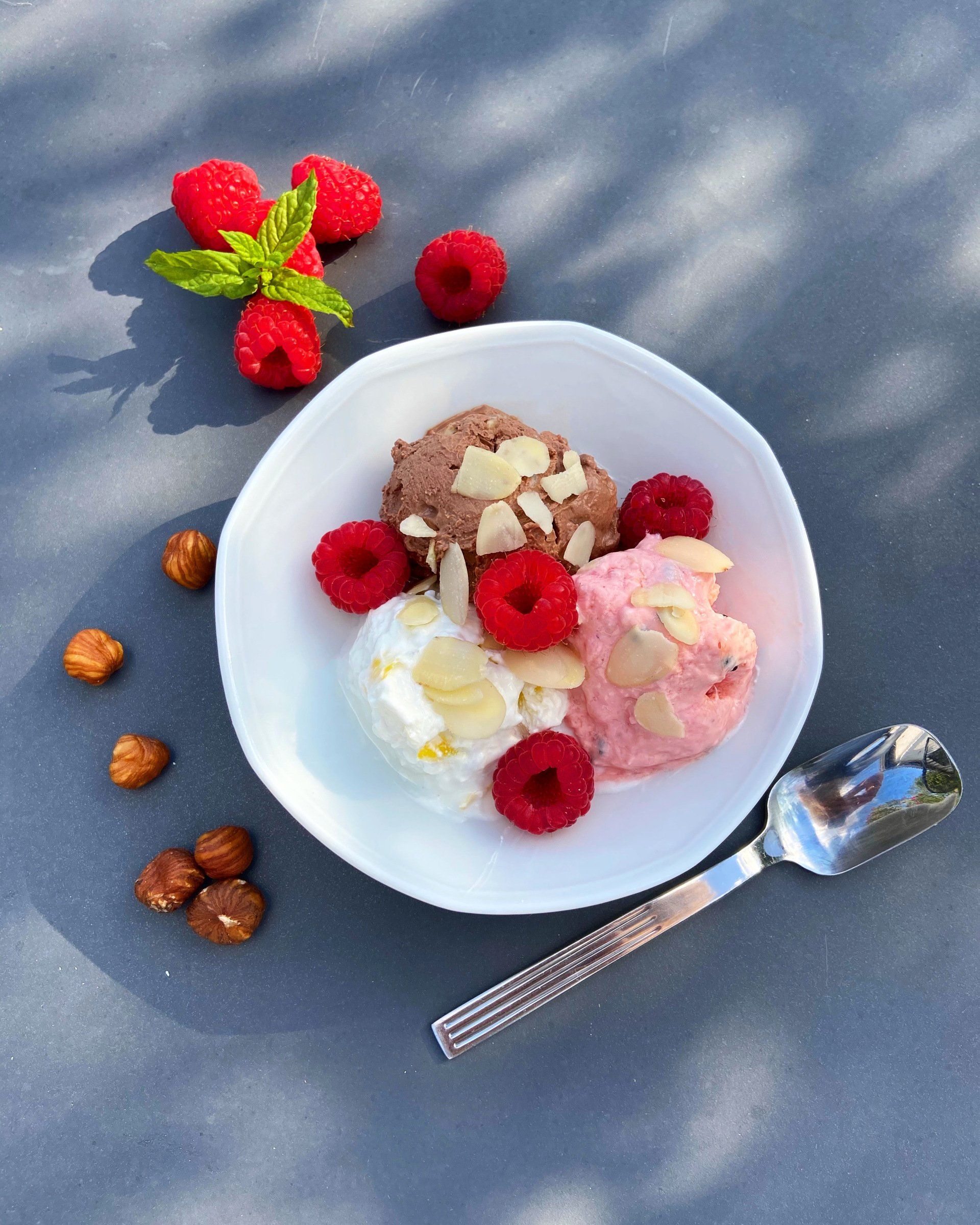 - Ajoutez quelques toppings de votre choix pour les dégustez, ici, j’ai choisis des amandes effilées🥜, quelques framboises et des feuilles de menthe🌿